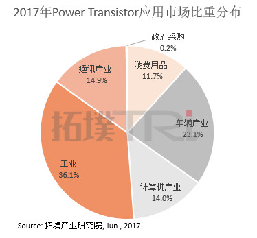 根據(jù)拓墣產(chǎn)業(yè)研究院調(diào)查顯示,在各國政府致力於節(jié)能減碳政策的推動之下,促使汽車工業(yè)與ICT科技進一步結(jié)合,預(yù)計將帶動與車輛能源管理相關(guān)的模擬IC與分離式功率器件(Power Transistor)在單一車輛的搭載金額,由2016年的188美元上升到2017年的209美元,車輛產(chǎn)業(yè)占Power Transistor需求比重達23%,僅次於工業(yè)用需求。